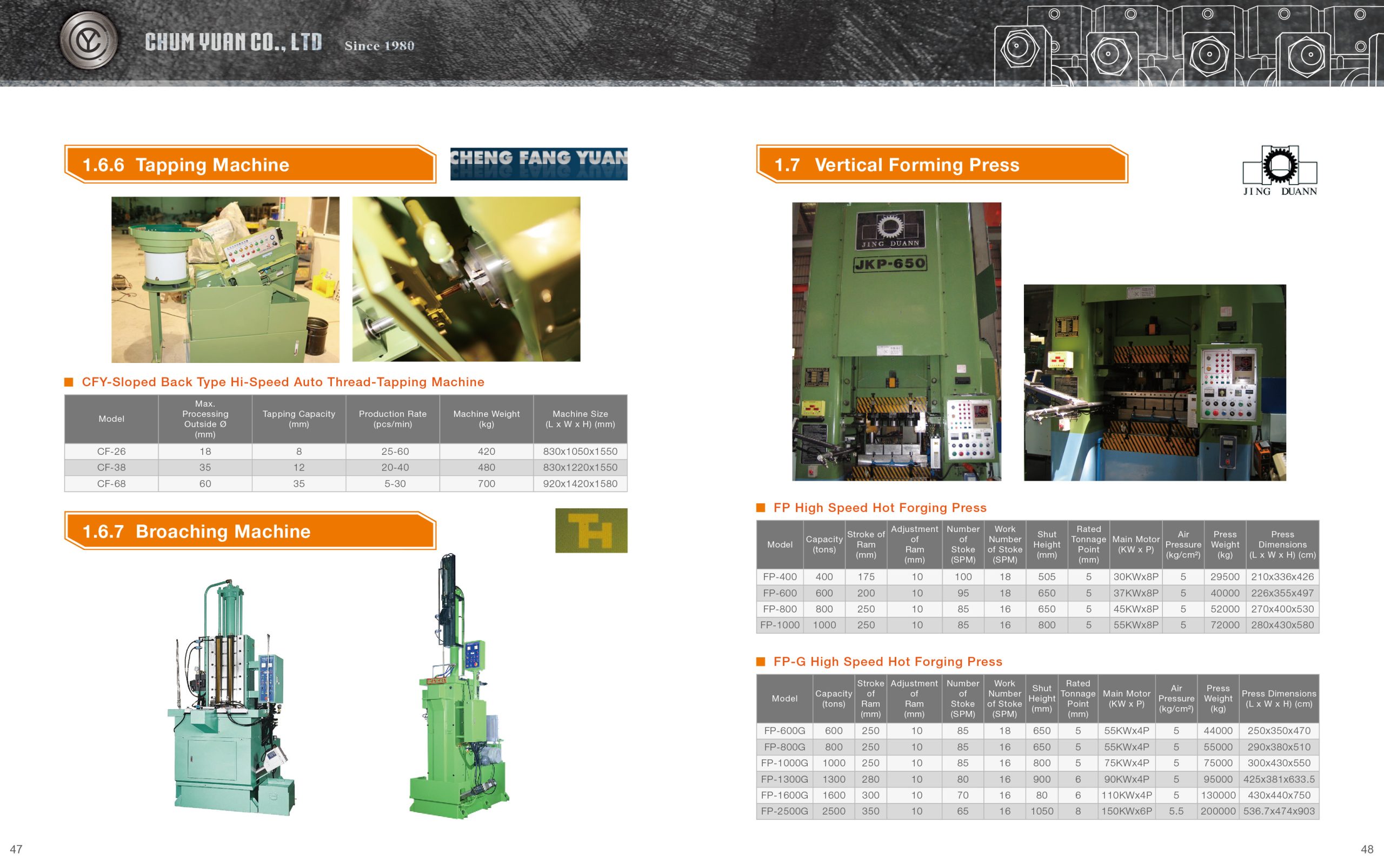As prensas verticais podem ser por forjamento à quente ou à frio, formando a peça por força de compressão. A dimensão e o formato do material são alterados, mas não o volume da peça. Geralmente são utilizadas para formar muitos tipos de peças, como rodas de carro, buchas, engrenagens e parafusos/porcas de grandes dimensões. Para estas máquinas trabalhamos com fornecedores de Taiwan.
